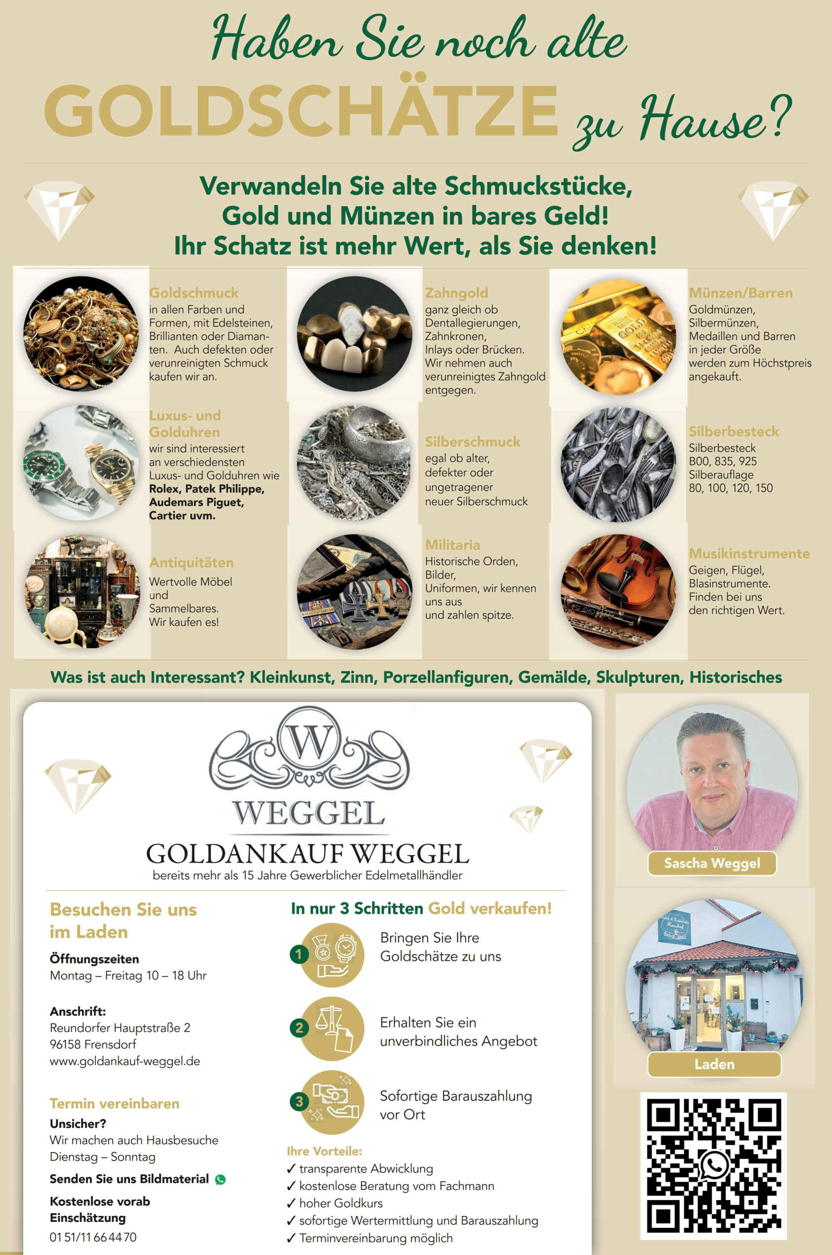 Willkommen bei unserem Goldankauf-Service! Wir bieten Ihnen die Möglichkeit, Ihren Goldschmuck, Silberschmuck ( auch defekt ), Nobeluhren, Münzen, Barren oder andere Wertgegenstände und Antiquitäten zu einem fairen Preis zu verkaufen. Wir zahlen stets Börsenabhängig, tagesaktuell und garantieren Ihnen eine diskrete Abwicklung.